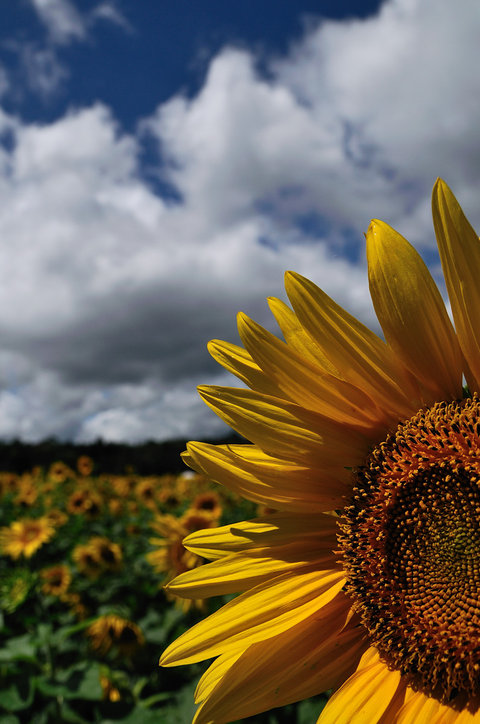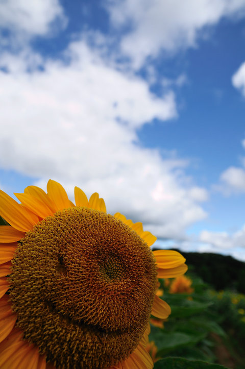 ひまわりは,みんな同じ方を向いて咲きます。朝,お日様が昇る方に。だから,順光のひまわりを撮るんだったら,朝がいいんです。だけど自宅から遠いので,早朝のひまわりってわけにはいきませんでした。ちょうどお昼前。