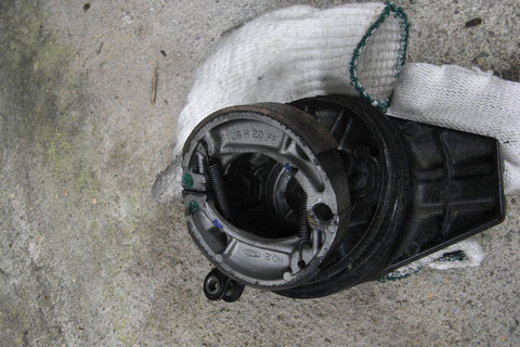 思っていたよりきれいです。アクスルもさほど錆びていません。ベアリングもスムーズに動いています。とりあえず,シューの当たる部分をサンドペーパーで軽く掃除をしました。