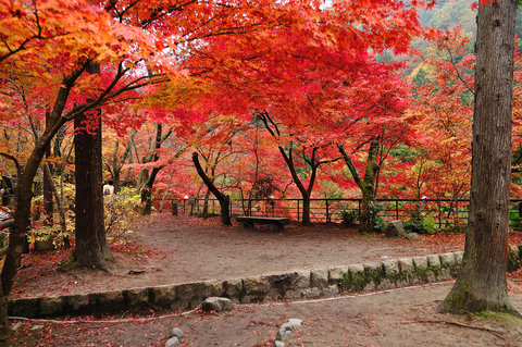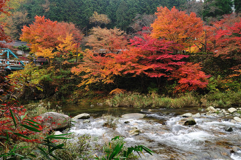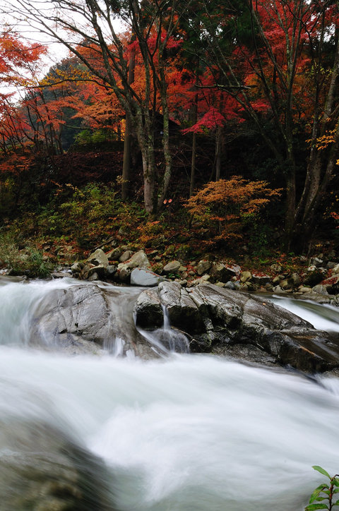 いつも思うけど,奥津渓谷はもみじの赤が鮮やかできれいです。青空だったら最高だろうな。