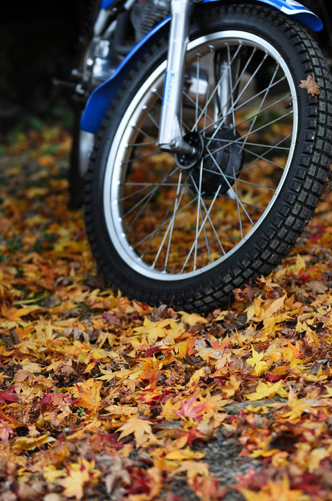 まあ,せっかく来たんだからということで,落葉の道を走ってきました。よく乾いているので,バイクで走ると落ち葉が,