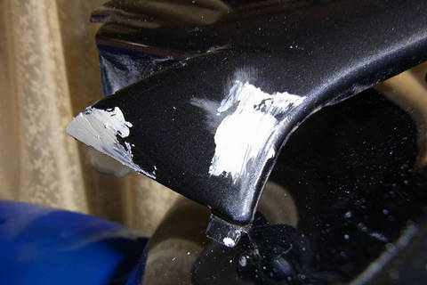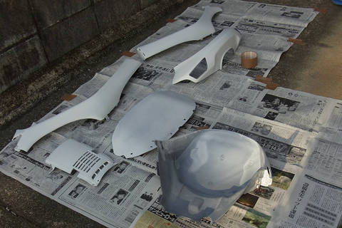 臭いにおいに耐えながら,部屋の中で一週間程度乾かしました。その後,800番のサンドペーパーで,表面がつるつるになるまで水研ぎです。カウルの角の部分は,塗装を削り過ぎないように注意深く研磨します。