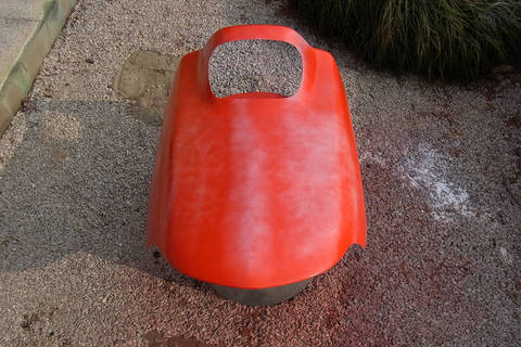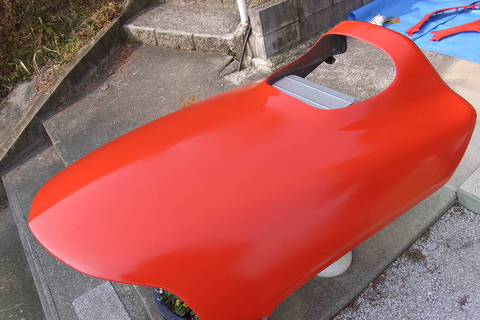 800番サンドペーパーで水研ぎしたカウルにいよいよ色を付けます。単純に「赤」です。安物ラッカースプレーを4本買ってきて作業開始です。
