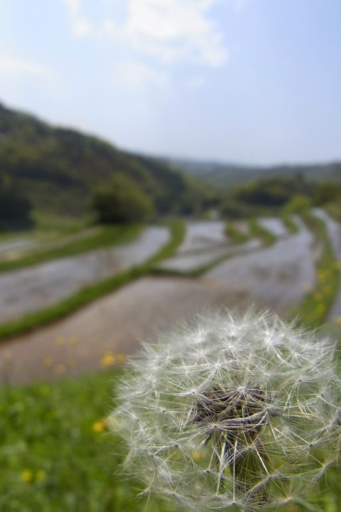 棚田そばにはたんぽぽの綿毛が。風が強く吹くと,空を舞っていました。