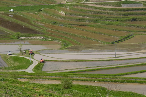 田には水をあてています。すでに田植えを終えているところもありましたが,まだしろかきも終わってないところがほとんどです。