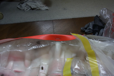 表皮を張る前に、防水処理をします。シートにスプレーボンドを適当に吹き付け、ビニールで覆います。ちなみにゴミ袋です。これをやっておくと、防水処理はもちろんですが、後にシートを張る時に、引っ張るのが非常に楽になります。