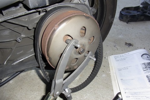 クラッチアウターを外します。こちらもセンターナットが緩まないので、鉄パイプの登場です。事なきを得ました。
